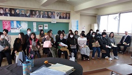 豊間地区では震災被害の語り部の大谷慶一・加代さん夫妻、大河内喜男さんの3名に震災の時の津波の様子、避難している時の自分の状況、その後の自分の体験や気持ちの変化などを詳しくお話していただきました。生徒たちは真剣に話を聞き、遠足のしおりにその内容を記入していました。本当に立派な態度で話を聞いていました。