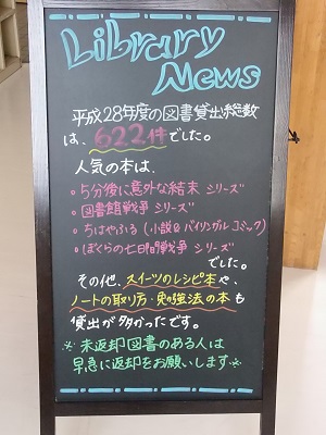 平成28年度の図書の総貸出冊数です。現在も司書と図書ボランティアと図書委員の手で明るく利用しやすい図書室づくりが進んでいます。また、毎年新しい本が入庫してますので、次年度はさらに利用者も貸し出し図書も増えることを期待しています。