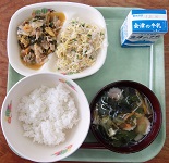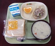 今日は、別の1年生が考えてくれたメニューで、食パン、鶏肉のクリームシチュー、レンコンとベーコンのペペロンチーノ、牛乳、デザートにオレンジがつきました。どれもおいしかったのですが、ペペロンチーノはレンコンのしゃきしゃき感がたまりませんでした。