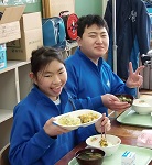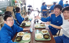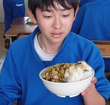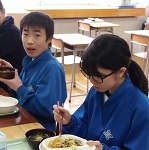 2017年3月10日 18時11分 9日(木)は3年生にとって最後の給食でした。この日は3年生のリクエストメニューで豚キムチ丼、バンサンスー、チンゲン菜のスープでした。ご飯部門最人気とあって、3年生の教室はどこも笑顔と食欲にあふれていました。毎日、安全でヘルシーでおいしい給食を作ってくれる調理員さん達に感謝して味わっていました。