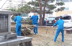 冬の間木々を雪から守っていた囲いは用務員さんによって順次とりはずされていますが、外清掃の生徒達も元気よく協力しています。