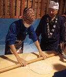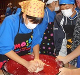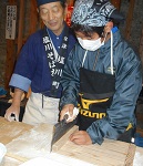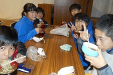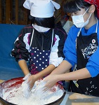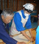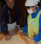友の会の皆さんの名人技を全員で見た後、16班に分かれて実技を行いました。そば打ちは初めての生徒がほとんどでしたが、友の会の皆さんのていねいな指導でおいしいそばを打ち上げることができました。