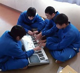 4人でグループを組み、ドローン、伴奏、メロディ、合いの手を分担しました。タイトルを考え、それぞれに曲想をイメージして自由に曲作りをしました。使うのはキーボードの黒鍵だけ、長さは4分の4拍子、4小節。20分ほどで見事な曲が完成し、発表し合いました。その後、各班をリレーして演奏したり、二つの班が同時に演奏したりしました。