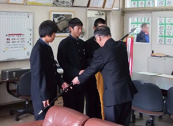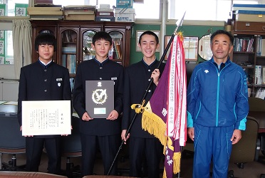 11月3日(木)に行われた第32回蔵のまち喜多方健康マラソン大会「市内中学校対抗団体戦」で、本校男子チームが2連覇を果たしました。本日は、大会実行委員長を務められた喜多方市体育協会長の瓜生敏夫さんが来校され、校長室において優勝旗と賞状を授与していただきました。