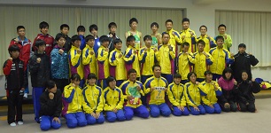 壮行会では、団長あいさつに続き監督より選手紹介がありました。市長を始めとする来賓から激励を受けた後市旗、ゼッケン、ユニフォームが授与されました。最後に主将が大会での活躍を誓い参加者全員で円陣を組みました。
