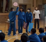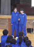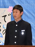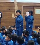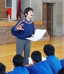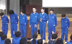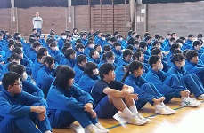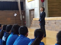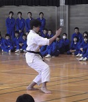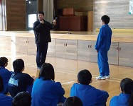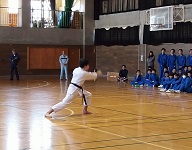はじめに、県大会に出場する女子ソフトテニスの選手とふくしま駅伝に参加する生徒を全校生で激励しました。その後空手の大会で活躍する須藤旭陽くんに演武を披露していただきました。初めて目にする生徒や教職員がほとんどであり、その迫力に圧倒されました。