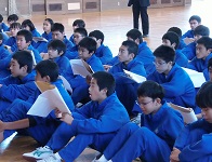 2016年11月4日 19時44分 5校時に、不審者が学校に侵入したとの想定で避難訓練を行いました。職員が対応している間、生徒は放送や先生の指示をしっかり守って行動していました。