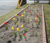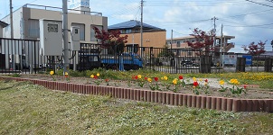 先日、かわいいチューリップの花が咲き、通学する生徒や沿道を通る人の心を和ませています。