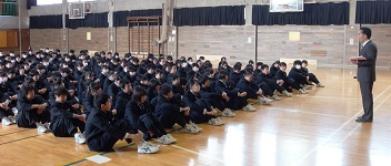 下の写真は春休みの生活についての注意を聞く真剣な表情の塩中生。