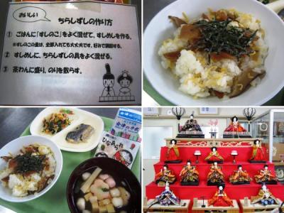 ちらしずし,さわらの西京焼き,おかか和え,すまし汁,ひなあられ,牛乳