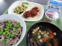 今日の給食はちょっと早いですが、3年生の卒業をお祝いして、赤飯とこづゆ、そして、3年生が選ぶ好きな給食ランキング第1位のからあげでした。よ~く味わって食べてくれました!