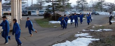 2016年2月1日 16時20分 「雪が少ねぇな」があいさつ代わりになっている今年の冬、夕べ降った雪は午前中に消え、校庭は乾いています。例年、冬期間の部活動は、体育館の他にプレイホールなどへの割当に従い屋内で活動しています。が、今年は・・・。写真は今日の部活動の様子です。割当のなかったバド部が前庭で活動しています。奥に見える校庭ではサッカー部と野球部が元気に動き回っていました。
