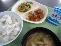 麦ごはん,ぶた肉の大豆ソースがけ,水菜と糸こんのおかか和え,根菜汁,牛乳【サンマルちゃんのカミングレシピ】