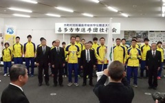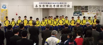 2015年11月13日 18時14分 15日(日)、7時40分の号砲とともに第27回市町村対抗福島県縦断駅伝競走大会がスタートします。大会を前に12日に選手団の壮行会が行われました。本校からは関本愛花さん(2年)が15区を走る予定です。これまでの練習を自信とし仲間の思いをたすきに込めて力走します。