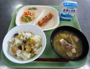 今日の給食には、秋の味覚をたくさん取り入れました。さつまいも、栗、しめじの混ぜごはん。まいたけ、大根が入ったみそ汁。秋の味覚をよ~く味わって食べてくれました!栗&さつまいも しめじ まいたけ