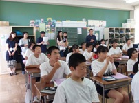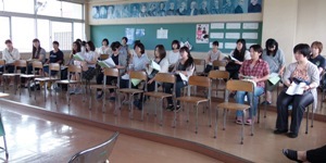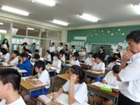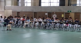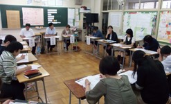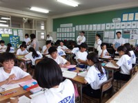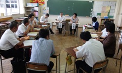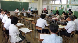 2015年7月8日 18時14分 本校には塩川地区の4つの小学校から入学します。地区内の5校は生活指導や保健指導などで小中の連携を図って教育効果を高めています。学習指導においても年2回の小中連携授業研究会を開いており、今日はその第1回を本校で開催しました。中学1年生の国語、数学、英語と特別支援学級の作業を参観し、それぞれの部会で研究協議を行いました。