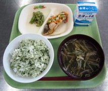 菜めし,アジの南蛮漬け,アスパラのごま和え,ひき肉ともやしのスープ,牛乳