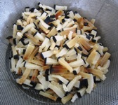 会津地方の郷土料理、くじら汁。新じゃがや新玉ねぎが収穫される頃、くじらの皮を塩漬けにした塩くじらと夏野菜をたくさん使って作る具だくさんのみそ汁です。夏の厳しい暑さを乗りきるためのスタミナ食として食べられています。山々に囲まれている、ここ会津で、海産物の入手が非常に困難だった時代、保存性の高い塩くじらを活用することを思い立ったことは、この土地ならではの工夫です。