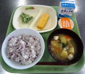 ゆかりごはん,厚焼きたまご,アスパラのわさびマヨ和え,くじら汁,豆乳デザート,牛乳