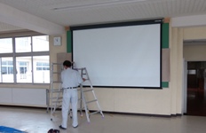 プレイホールに大型のスクリーンを設置しました。幅が3mほどもあります。今まで図書室にあったものですが、より活用できるようにしました。