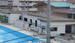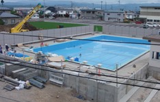 仮オープンに向けて工事が着々と進んでいます。プール本体の据え付けが間もなく終わります。内装や、配管、機械設備関係で多くの業者の方が作業に携わっており活気があります。