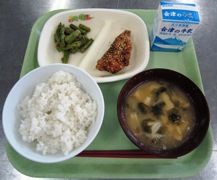 麦ごはん,かつおの蒲焼き,アスパラのおかか和え,あおさ入りみそ汁,牛乳