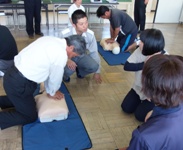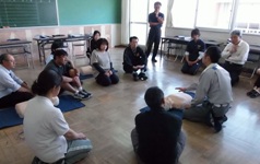 2015年5月22日 18時07分 今日は職員会議の前に職員対象に救急講習会を行いました。本校には職員玄関と体育館入口にAEDが設置されています。不測の事態への備えですが、ハード面とともにソフト面での充実が不可欠です。そこで、短い時間ですが、消防の方においでいただき心肺蘇生法、AEDの使用法、エピペンの使い方について学びました。