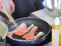 1年1組は、家庭科の授業で調理実習を行っていました。鮭のムニエルづくりをメインに実習です。鮭の水分を取り小麦をまぶして焼き上げる工程を行っていました。
