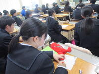 これは、生徒同士がお互いを認め合い、お互いのよさに気付く学びです。お互いのよい行動や言動に目を向けさせることにより、望ましい人間関係づくりを目指します。いつもは言えないこと、過去に言いそびれてしまった感謝の言葉、 気付いた友達のよさをカードに書き込みます。後日、生徒会役員が「ありがとうの川」を完成させます。