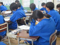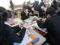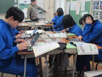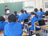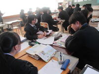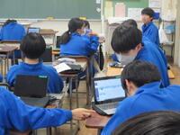 社会は、地理的分野で、東北地方のよさを活かしたイベントを考える授業でした。伝統文化や郷土料理などの既習事項を整理し、小グループでイベントを考案していました。