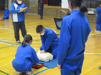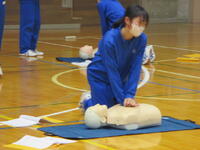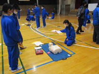 保健体育は、救急救命の実習を行いました。簡易人体模型を使って、AEDの使い方、心臓マッサージ、人工呼吸を代わる代わる演習しました。