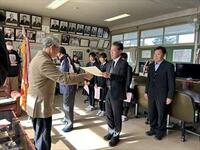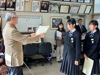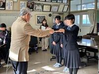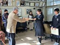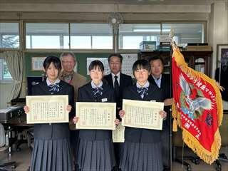 校長室において、蔵のまち喜多方健康マラソン大会の市内中学校対抗団体戦の表彰式が行われました。本校は、女子団体で優勝し、3名の生徒の皆さん(2年・戸田さん、鈴木さん、1年新國さん)に市体育協田沢会長様から、表彰状が授与されました。おめでとうございました。