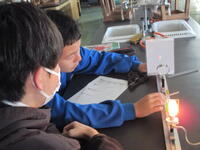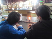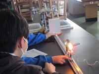 理科の授業で、モノの見え方の実験を行っていました。光源とレンズ、スクリーンを動かして、はっきりと映します。之を複数回繰り返して記録し、物質の屈折とものの見え方に関する理解を深めていました。