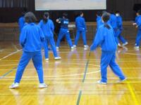1年2組は、保健体育の授業でした。体育館で、ダンスの練習でした。ステージに映された模範動画を見ながら、さまざまなステップの練習をしていました。