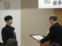 写真は、佐川教育長様から生田目さんが賞状を授与されたときの様子です。