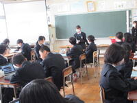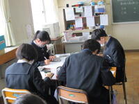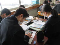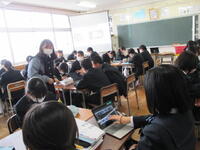 1年3組は、理科の授業でした。「火成岩の成り立ち」について、さまざまな岩石を観察し、その特徴を比較して整理してまとめてました。その後、各班ごとに発表していました。