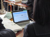1年2組は、数学の授業でした。いろいろな代表値を比べる内容でした。並べたたくさんの数字から、電卓を使って平均値を求め、その後は中央値を求める学習でした。