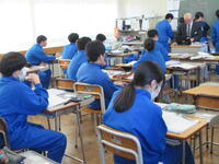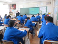 3年1組は、英語の授業でした。「Borderless Friendship」を題材にした長文を読み、いくつかの質問に答える学習でした。オリンピックスケーター小平奈緒さんのお話です。周囲の生徒同士で、単語を辞書等で調べ、内容を読み解く学習活動でした。