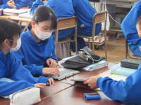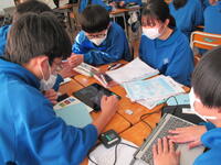 1年3組は、理科の授業でした。火山活動でできたいくつか石を顕微鏡で撮影し、比較し、異なる点を整理する授業でした。小グループで、タブレット内で整理した画像を見比べ話し合いながら作業を進めていました。