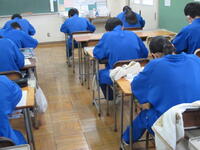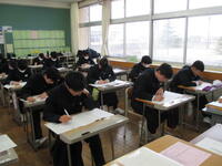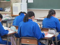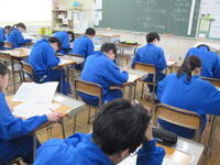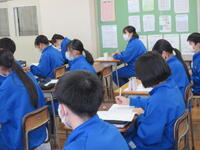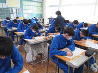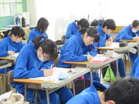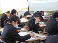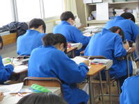 2024年1月15日 15時45分6校時の3年生授業は、県立高等学校入学願書の清書でした。本日の授業前までに下書き、先生方の確認、そして願書に鉛筆書きまで行いました。生徒の皆さんは、真剣な表情で記入していました。担任の先生は、それぞれの下書きを細かく確認し、指導していました。そして、本日、鉛筆書きの上からペン等で記入を済ませ、最後に消しゴムで鉛筆書きを消し完成となります。今日は自宅に持ち帰り、保護者の方に記入のご協力をお願いいたします。