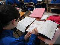 3年2組は、理科の授業でした。太陽など天体の動きについて、ワークブックの問題練習に挑戦しいていました。