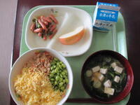 三色丼、野菜とウィンナー炒め、果物、野菜たっぷりみそ汁、牛乳でした。彩り豊かな給食をいただきました。