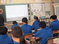1年2組は、英語でした。例文を参考にして、学校の中で〇年〇組は、どんな授業を行っているのか、ペアで質問・応答のやりとりを練習していました。