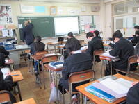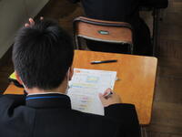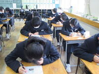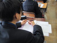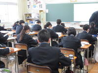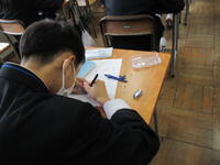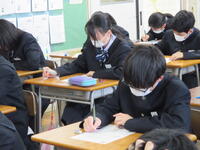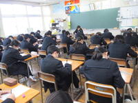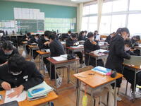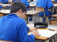 2023年12月8日 16時30分放課後、3年生は、私立高等学校の入学試験に向けた願書記入を始めています。既に面接練習は始めていましたが、いよいよ事務手続きが本格化します。机に向かう生徒の皆さんは、緊張感をもってペンを走らせていました。今後、自分の進路実現に向けて、健康に留意しながら、学習を進めてほしいと思います。