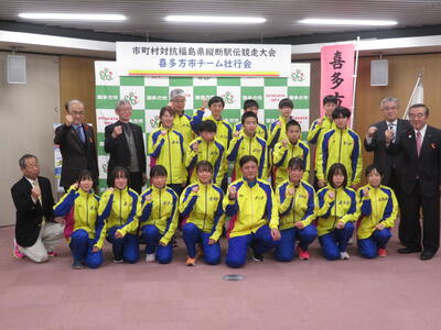 2023年11月17日 10時45分昨晩、市町村対抗福島県縦断駅伝競走大会・喜多方市チーム結団式が市役所で開催されました。式では、遠藤市長様、小林市議会議長様から激励のお言葉をいただきました。