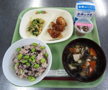 今日の給食はちょっと早いですが、3年生の卒業をお祝いして、赤飯・こづゆ・好きな給食ランキング第2位のからあげでした。とっておきのお祝い献立、よ~く味わって食べてくれました!