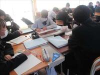 2組は、数学でした。二つの直線がなぜ平行と言えるのか、グループ内で作図しながら、考え話し合っていました。