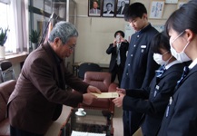本日は、社会福祉協議会の方が、原発事故のために避難している生徒を激励するために来校されました。一人一人に激励の品を手渡し、困難に負けないでがんばってほしいと声をかけていただきました。激励を受けた生徒は「塩川に来た時には、友だちと離れて心細かったが、今ではたくさんの新しい友だちと一緒に元気に学校生活を送っています。本日はありがとうございます。」とお礼の言葉を述べました。