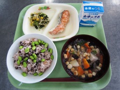 赤飯,新巻鮭のからあげ,おかか和え,こづゆ,牛乳