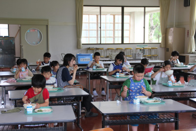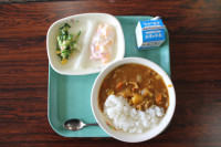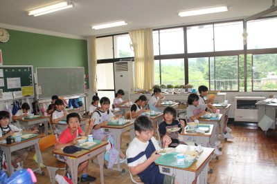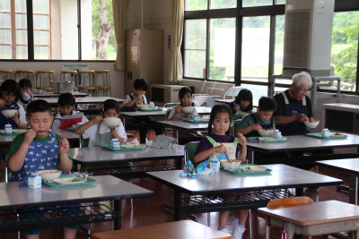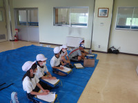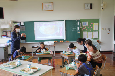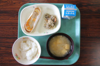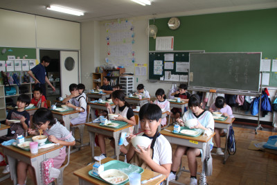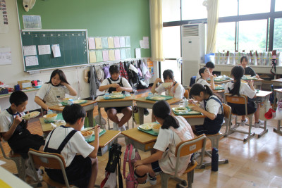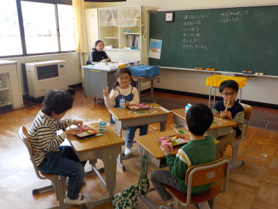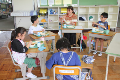 ご飯は、6年生と一緒に収穫したお米、みそ汁の大根は、ちょっと小さかったけれど、自分たちで畑に植えたものを使いました。